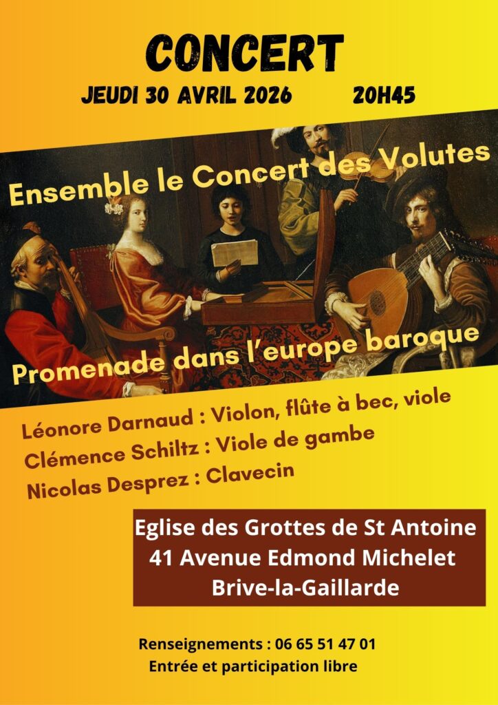 Concert : Promenade dans l’Europe baroque Laisser un commentaire / Uncategorized / Par Webmaster Le Concert des Volutes se produira le jeudi 30 avril 2026, à 20h45 au Sanctuaire des Grottes de Saint-Antoine, à Brive-la-Gaillarde. Léonore Darnaud (violon, viole de gambe, flûte à bec), Nicolas Desprez (clavecin) et Clémence Schiltz (viole de gambe) offriront une promenade dans l’Europe baroque : Sweelink, Nicolai, Telemann, Couperin, … Entrée et participation libres.